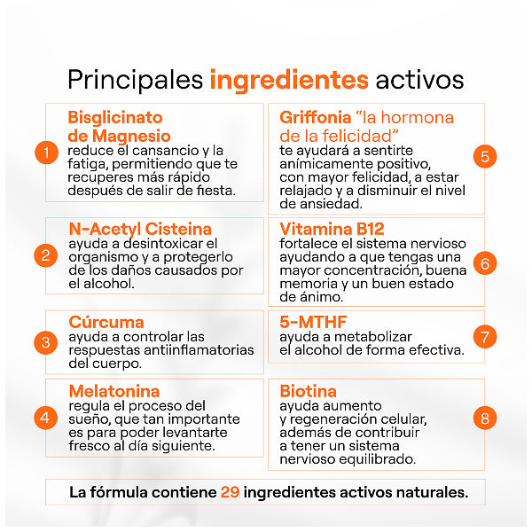 BACK2LIFE es un suplemento diseñado para ayudarte a superar los efectos de la resaca y restaurar tu bienestar después de una noche de excesos. Con una fórmula avanzada que combina ingredientes naturales y efectivos, este suplemento trabaja rápidamente para aliviar dolores de cabeza, náuseas, y fatiga, devolviéndote la energía y claridad mental que necesitas para enfrentar el día.